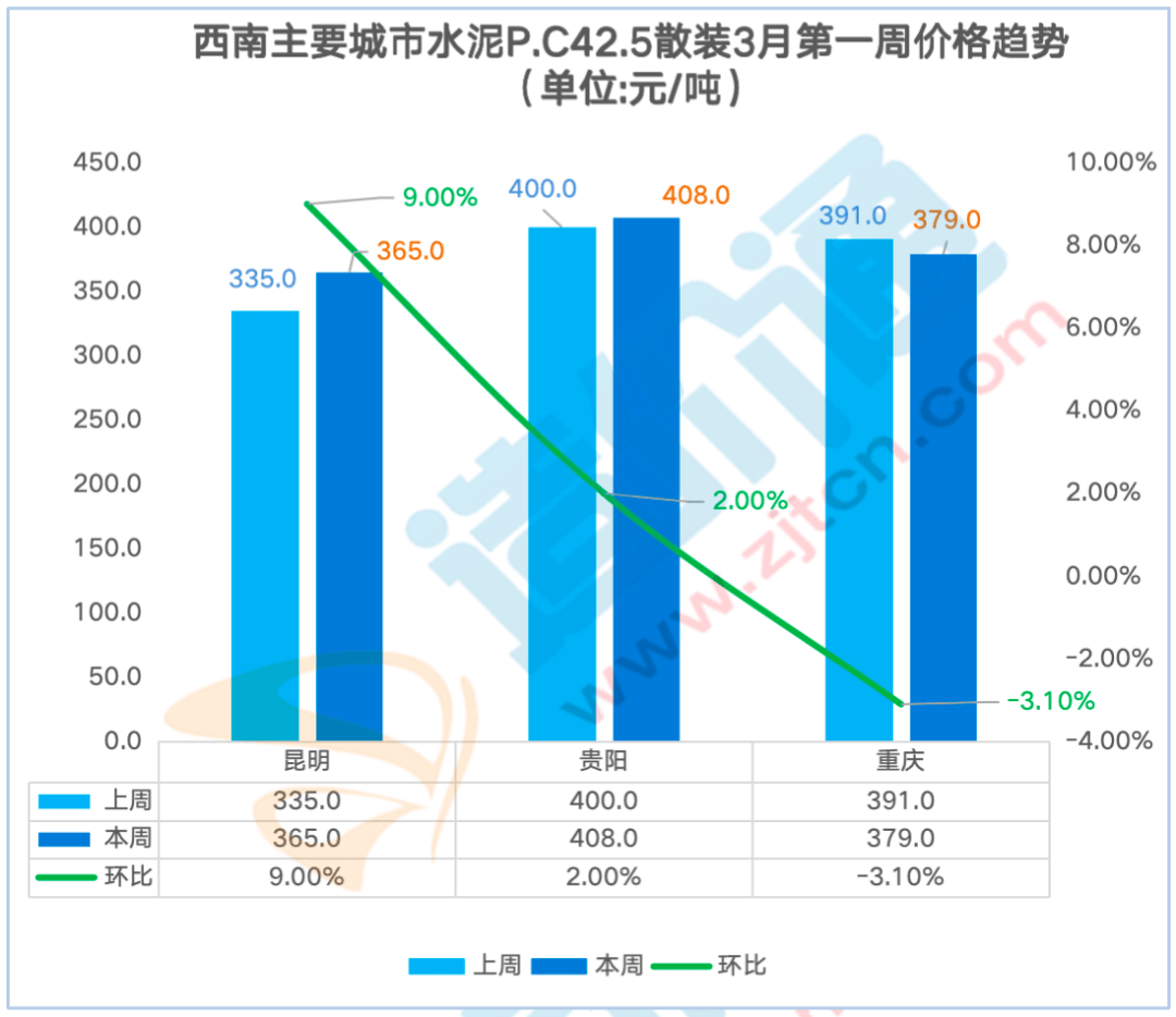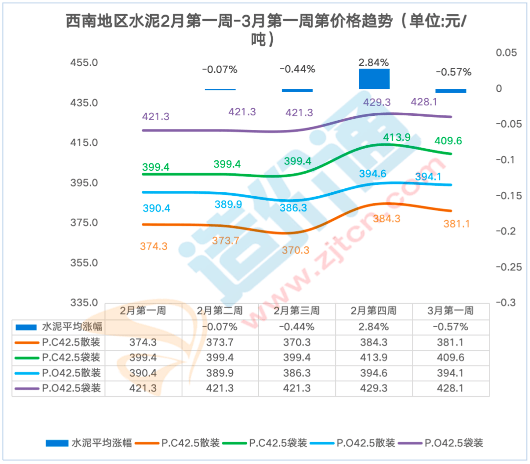 水泥P.C42.5袋拆价本周涨跌幅为4.70%,西南地域的水泥2月第一殷勤2月第三周和2月第四殷勤3月第一周呈下跌趋向,